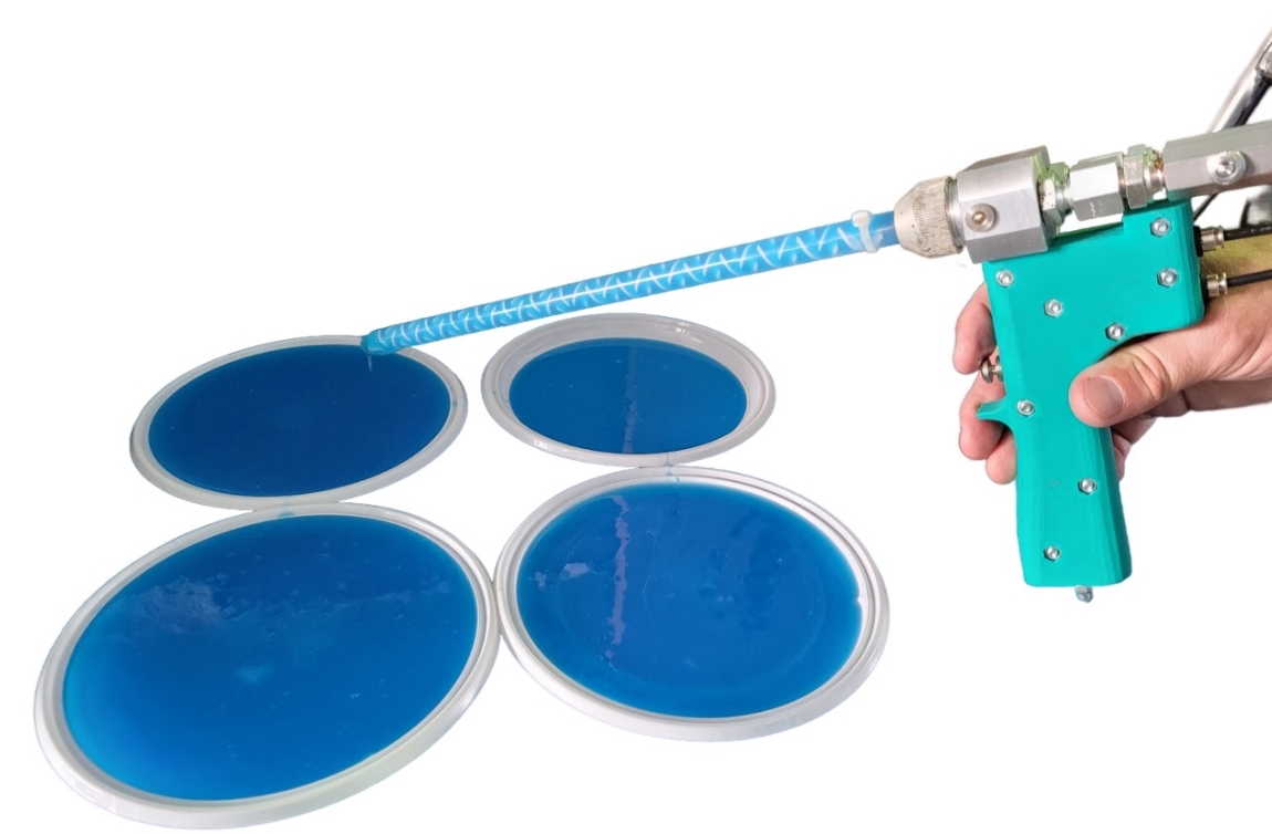 Оборудование комплектуется специальным пистолетом, который позволяет не только заливать, но и напылять силиконовую композицию. Для этого на статический миксер крепится распылительная насадка.
